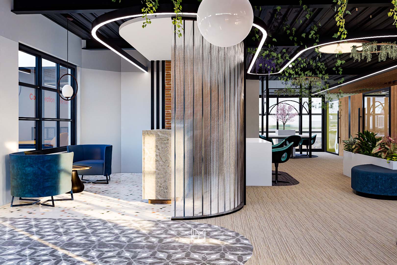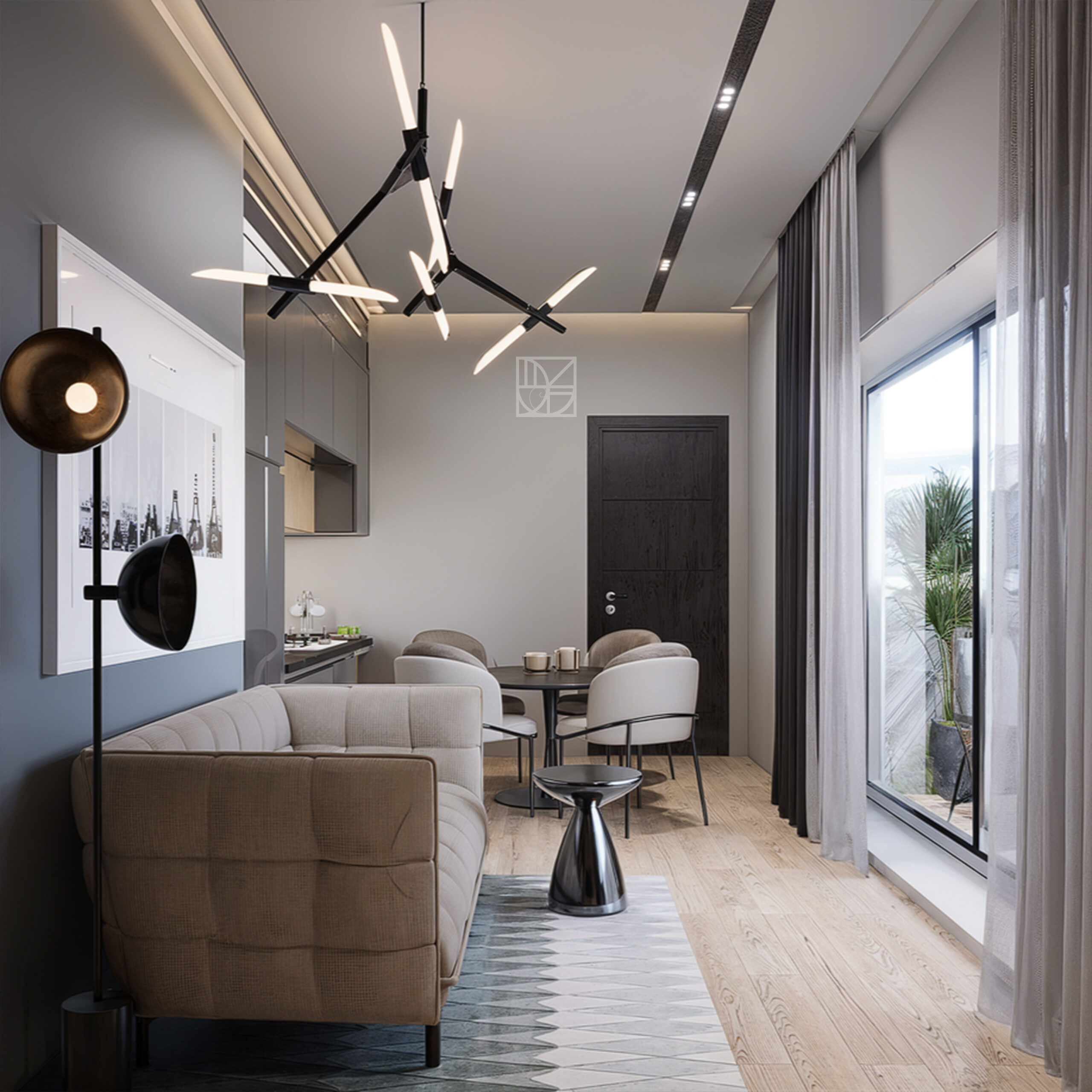 contemporary living space with light-themed accents against bold, dark walls and a luxurious marble TV wall